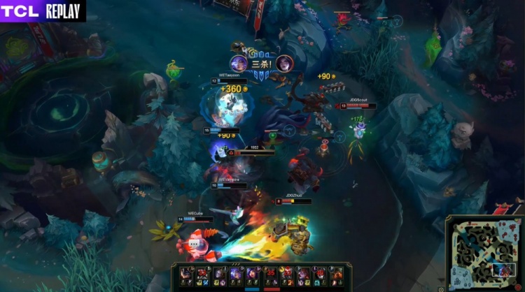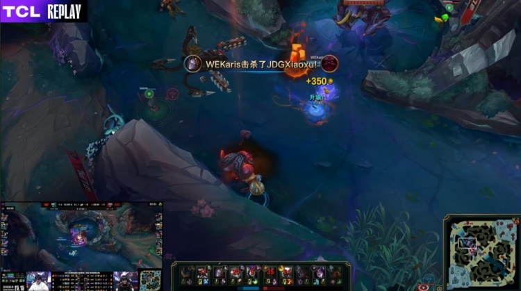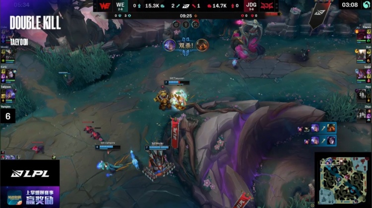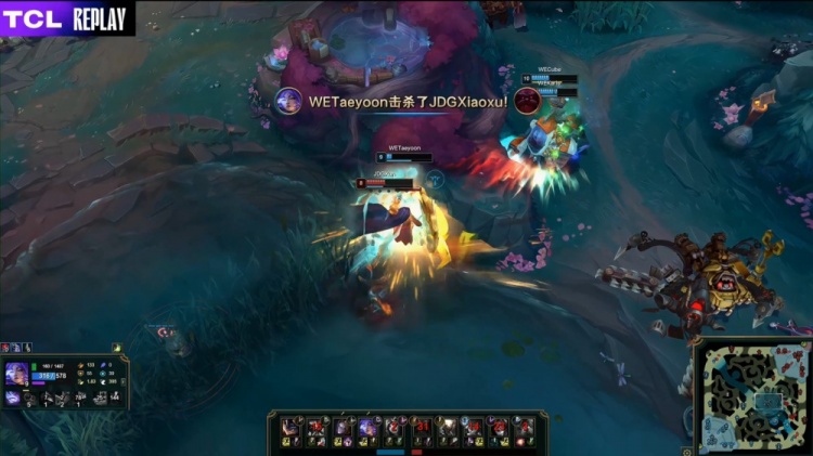【23:56】Monki入侵JDG野区拉三人,Taeyoon芸阿娜瞬间双杀,WE打出0换3。