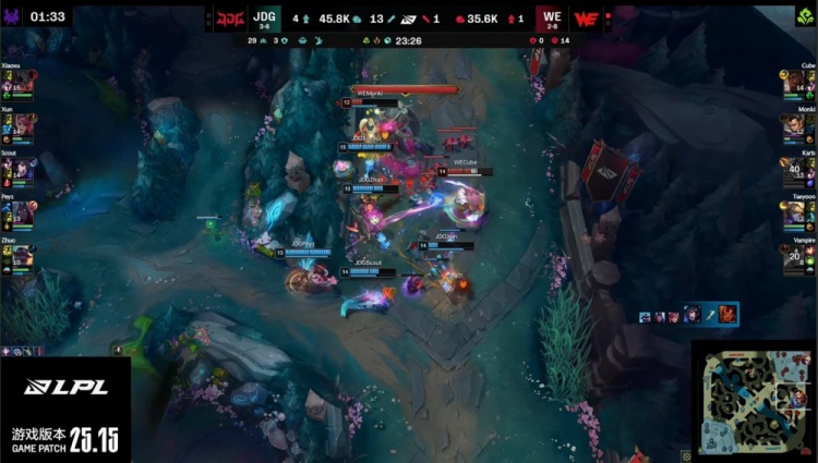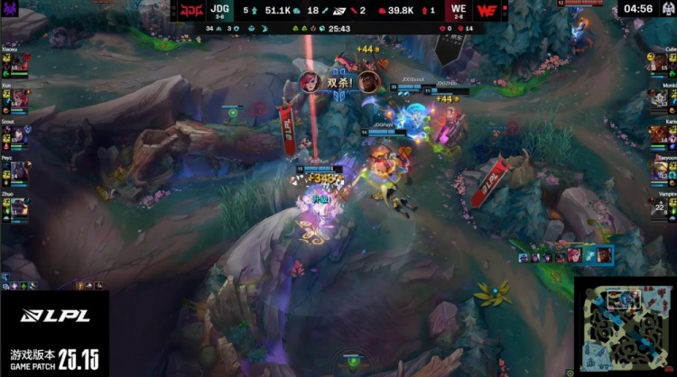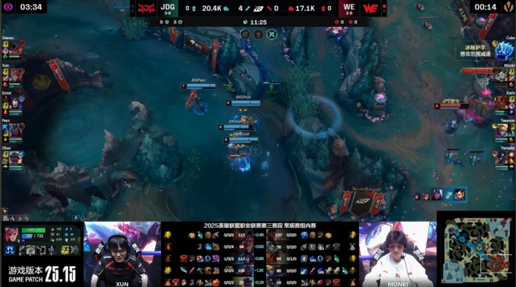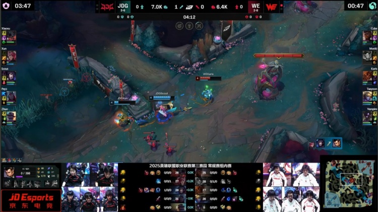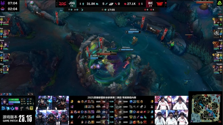 【25:51】JDG入侵WE野区找人,WE上野辅三人直接睡着毫无还手之力,JDG打出0换3回头吃掉大龙,经济领先1w3k。