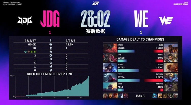 中期Monki赵信在下路三角草眼上蹲被杀,紧接着JDG控下先锋与小龙,中路Peyz韦鲁斯大招定住Monki赵信将其击杀,JDG逐渐拉开经济差距。后续厄塔汗团战中xiaoxu剑魔大灭开启连砍WE三人,JDG团灭WE并吃下厄塔汗。
