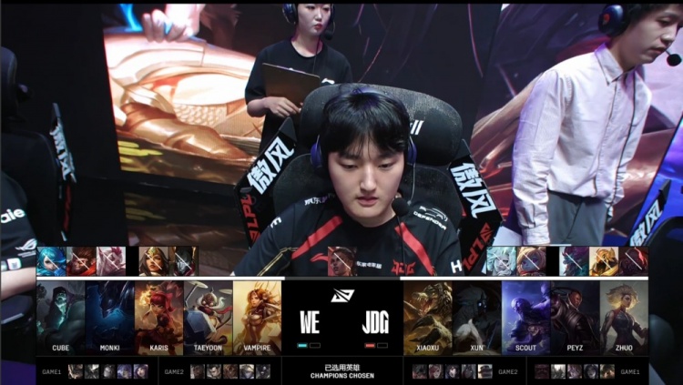第三局前期JDG主动发力,Xun千珏下路配合Zhuo芮尔集火击杀Vampire女坦先拿优势,随后巢虫团战Monki梦魇连斩Xun与Zhuo,WE扳回局面,但Peyz卢锡安迅速反扑击杀Karis安妮。