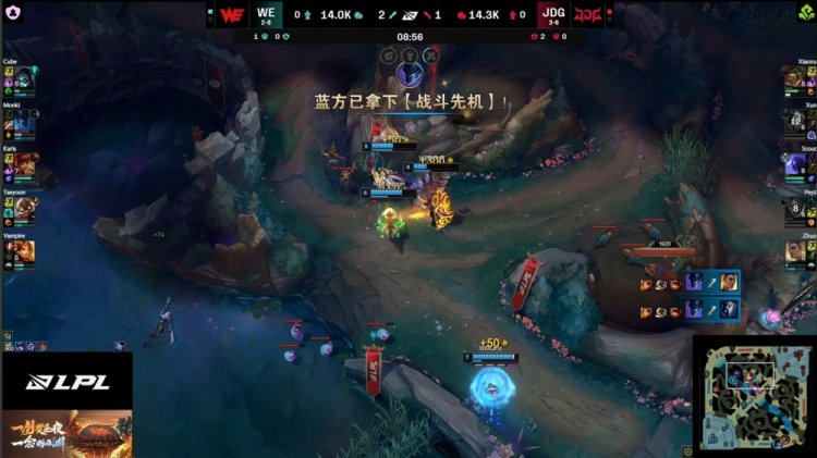 【12:38】WE入侵JDG野区逮捕Peyz,xiaoxu鳄鱼下路一塔塔下按B被WE四人越塔融化,Xun与zhuo来下未能保住xiaoxu但反杀WE野辅,双方打出2换2。