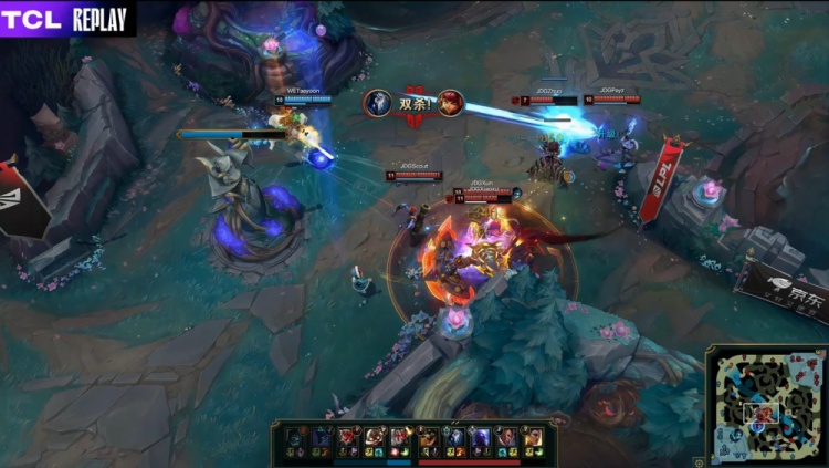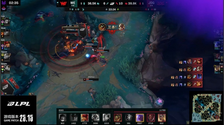 【30:46】JDG下路推进,Scout瑞兹被逮捕,xiaoxu鳄鱼野区1V4瞬间三杀,Xun与Peyz到场收割战场,JDG打出3换5团灭WE,一波推平WE基地拿到比赛胜利。