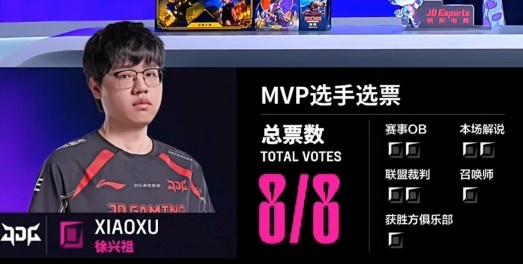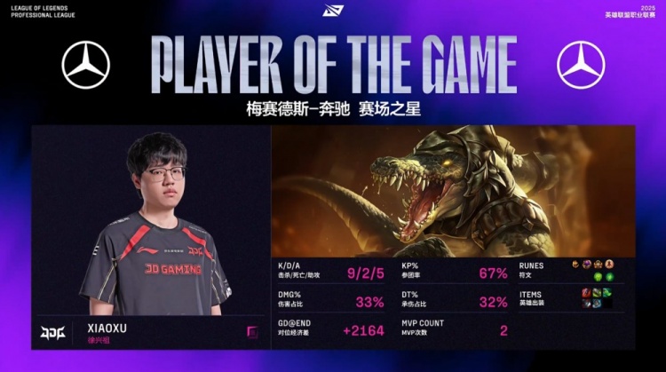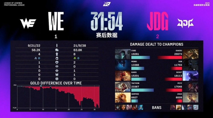 后期JDG持续入侵WE野区,xiaoxu鳄鱼大鳄鱼无人可挡,上路1v3反杀Vampire,后续野区1v4爆砍三杀,JDG团灭WE,一波推平WE基地拿到比赛胜利。