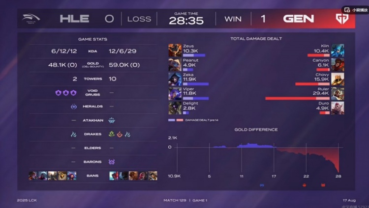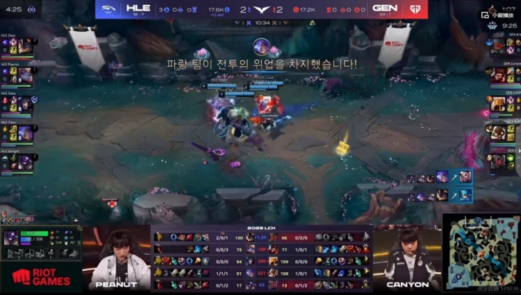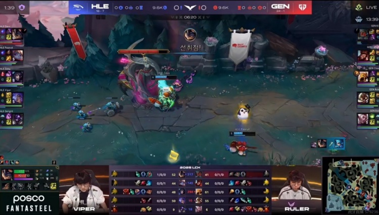 首局比赛Peanut波比保上,Zeus兰博上路支援之后又TP转下单切掉了Ruler库奇!但是GEN先手拿下三条小龙给足压力!中期Zeka阿狸边路带不过,全场唯一一次节奏就是配合队友抓死Chovy沙皇拿下第四条小龙!但是随后的团战HLE野辅根本吃不住伤害非死即残,GEN轻松拿下大龙之后HLE高地开团失败,被Ruler收集者库奇直接双杀掉了野辅!GEN抱团拆掉两路高地,直接一波推平基地拿下一分!