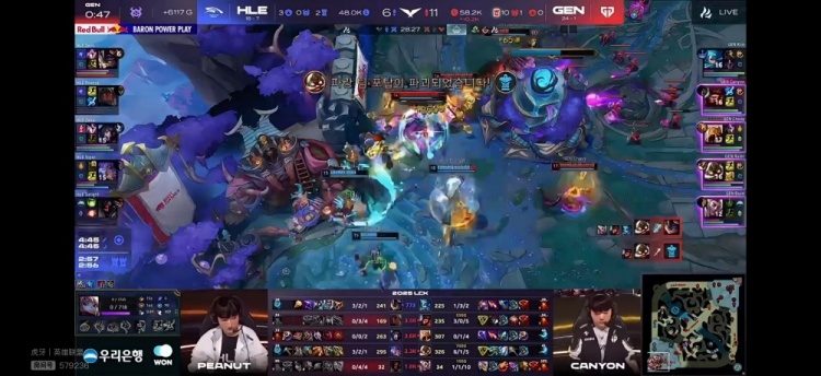 【22:50】河道Peanut波比被打残,草里回城被Duro洛一个救赎大激光直接带走!但是河道HLE四人也成功逮捕了Chovy沙皇!拆完GEN下一塔+拿下关键小龙!不过GEN也换掉了HLE上路二塔!