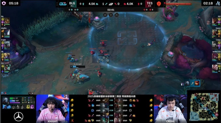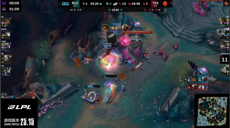 【18:05】中路混战,ON坐车撞飞TES四人到TES野区,但正面Kanavi劫瞬间融化Elk,Hang洛想过墙被shadow巨魔柱子卡回击杀,阿Bin来中路打团,369呆在上路不走,正面Kanavi劫送阿Bin大人头,BLG打出2换4,推掉TES中路二塔,双方经济持平。