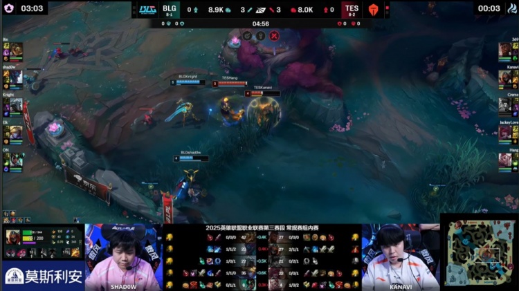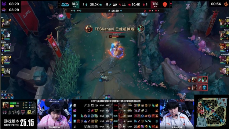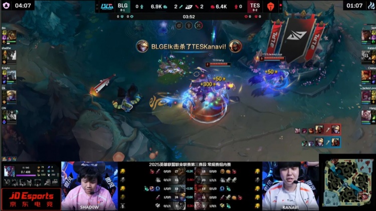 第二局前期,shadow巨魔多次抓Creme安妮取得击杀,Kanavi劫多次击杀ON卡尔玛,并带队多次入侵BLG野区,Kanavi对位领先shadow。
