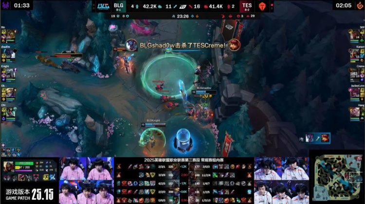 【23:23】shaodw巨魔下路侧面超车巨棒击杀Creme安妮,BLG三人下路推进拔掉TES二塔,经济领先2k。