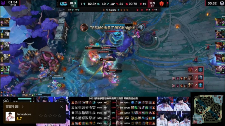 后期龙魂团水大哥双杀,BLG冲上TES高地但被Kanavi与369合力防守成功,二代大龙刷新,shadow脸探草丛被杀,TES连吃大龙与火龙魂,经济反超2k。