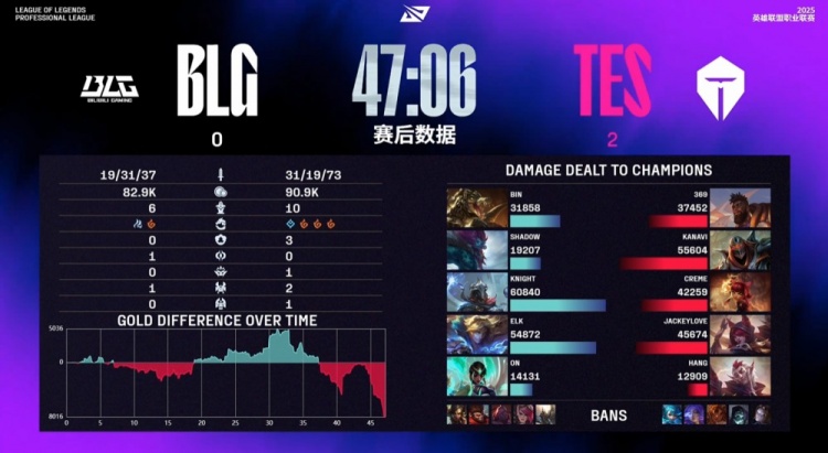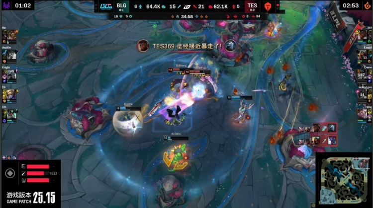 中期369奎桑提上路单杀Bin大哥鳄鱼,ON中路开车撞飞TES四人,369上路推线不来正面,BLG趁机打出2换4推掉TES中路二塔,双方经济持平。后续中路团战Kanavi爆掉ON但送Elk大人头,BLG吃掉大龙拿到3k经济优势。