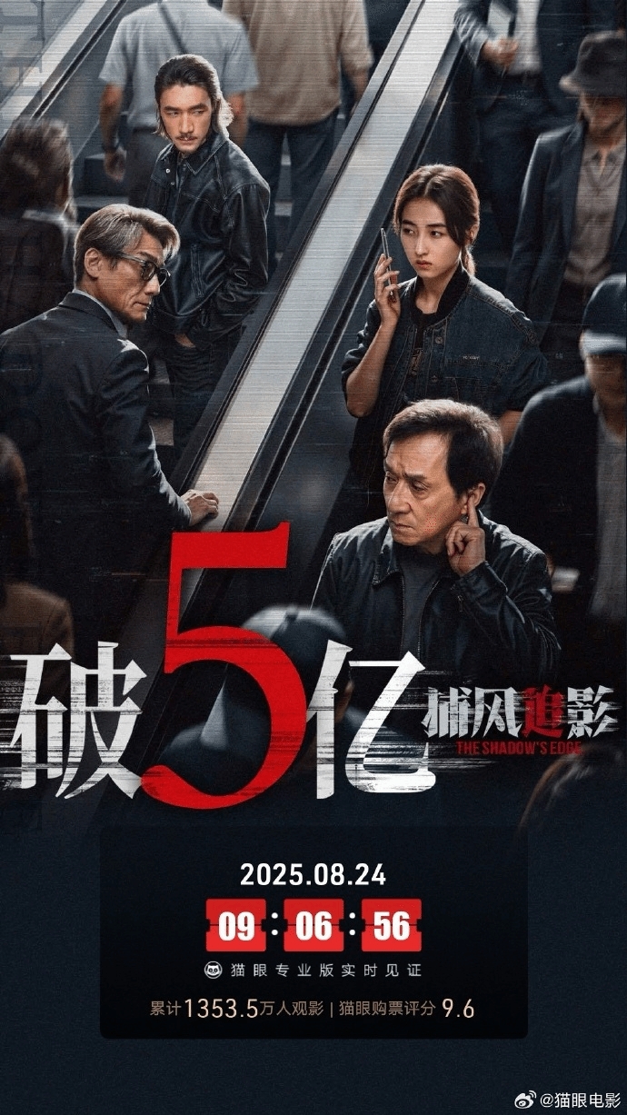 直播吧08月24日讯 根据猫眼专业版数据显示:截至今日9点06分,电影《捕风追影》上映9天, 总票房破5亿,目前豆瓣评分8.1分。