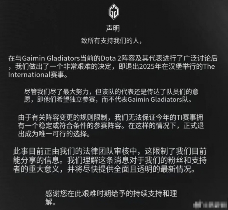 致所有支持我们的人, 经过与GG DOTA2现阵容及其代表的深入沟通,我们做出了非常艰难的决定,退出在汉堡举办的TI14;尽管我们尽了最大努力,但战队代表传达了选手们希望以独立身份参赛、不再代表GG旗帜的意愿。