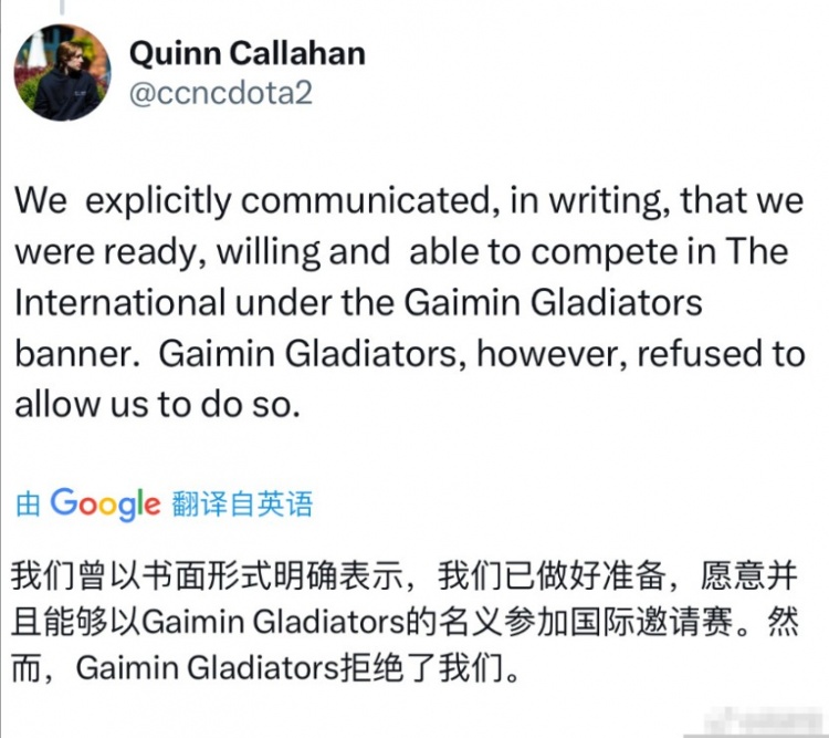而在GG发布退赛TI14的官方声明后不久,战队中单Quinn发布动态反驳了战队的说法: