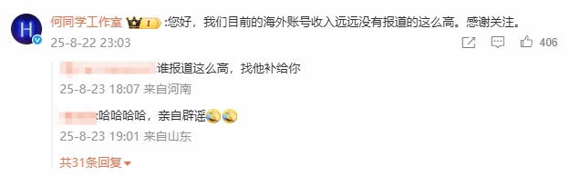很快,何同学工作室官方在这条新闻里进行了辟谣,说道:“您好,我们目前的海外账号收入远远没有报道的这么高,感谢关注。”