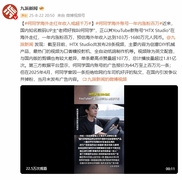 直播吧8月24日讯 日前,九派新闻谈到了国内知名数码UP主“老师好我叫何同学”,以“何同学海外走红年收入或超千万”和“何同学海外账号一年内涨粉百万”为词条,称何同学在YouTube的新账号一年内涨粉百万,预估海外年收入达到103万-1680万元人民币。
