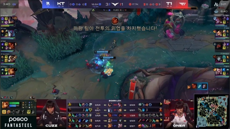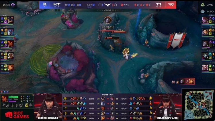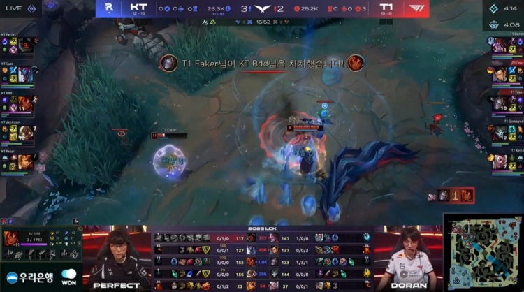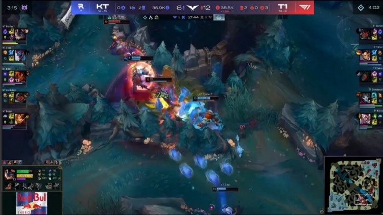 中期PerfecT兰博上路被T1击杀,Keria洛救下Faker反杀Bdd岩雀,T1中路打出1换4拆掉一塔取得领先。后续厄塔汗团战Cuzz巨魔击杀多兰阿萝拉,Oner赵信击杀deokdam飞机后被集火,KT缩小经济差距。