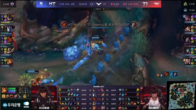 第一局前期Peter女坦中路被Faker发条击杀送出一血,但随后Bdd岩雀中路单杀Faker,KT通过中辅配合在上路再杀Faker建立优势。