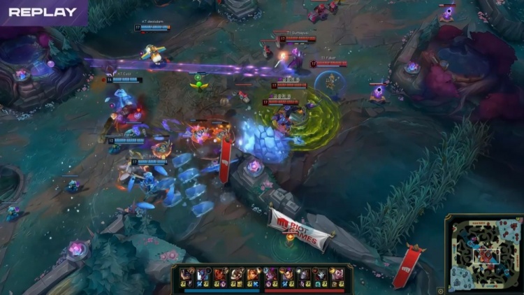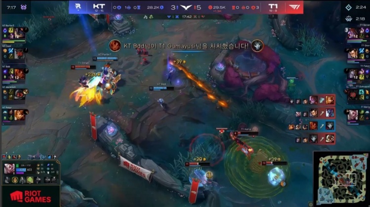 【17:35】中路混战,双方相互拉扯,deokdam飞机先被小吕布带走,多兰阿萝拉进场收割,Faker发条补掉bdd,T1打出1换4,推掉KT中路一塔,经济领先3k。