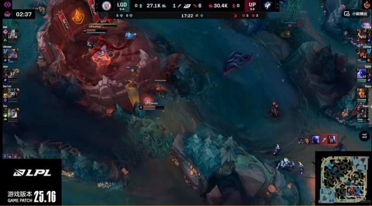 【17:02】小龙团UP集火+虚弱先秒xqw岩雀,随后团战sasi格温进场被拉扯,Xiaoxia牛头二连+Junhao猴子开转直接击飞LGD三人!这波最终Saber瑞兹追死Sav1or维鲁斯,UP打出0换4拿下听牌龙!