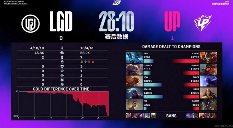 首局比赛Junhao猴子3级包上拿下双杀,对位压制climber波比!UP连续拿下小龙给到LGD压力!中期团战Junhao猴子+Xiaoxia牛头打出击飞配合,1Jiang兰博也贡献输出,关键小龙团UP一波0换4+先锋团2换3之后拉开经济差!随后LGD没什么反抗之力,UP拿下厄塔汗+火龙魂+大龙,一波团战0换5团灭LGD,结束掉了首局比赛!