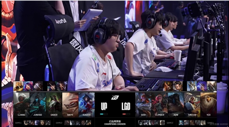 UP:上单1Jiang、打野Junhao、中单Saber、下路Baiye、辅助Xiaoxia