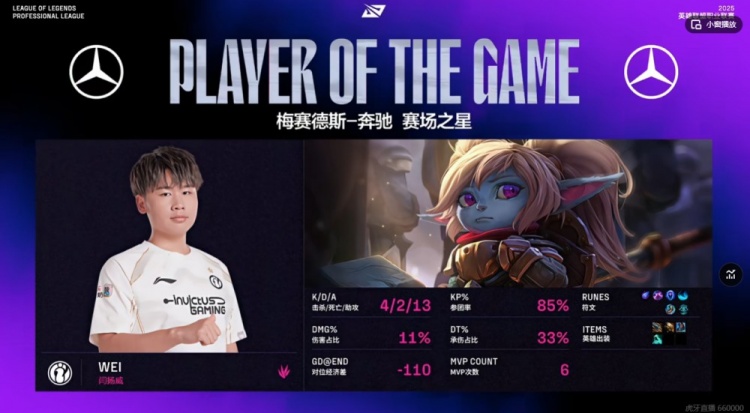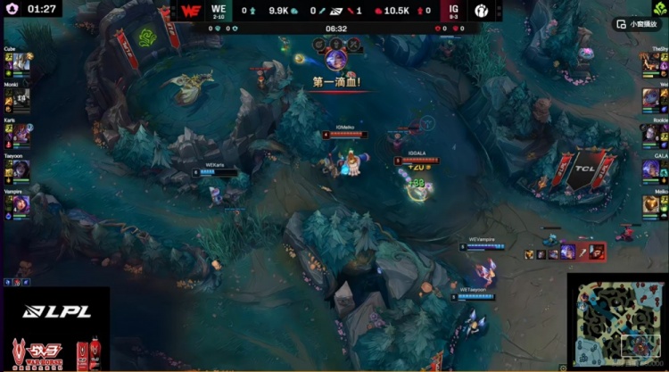 【6:32】河道遭遇,Wei波比闪现壁咚+坚定风采卡住了Monki猴子位置,GALA芸阿娜交闪拿下一血!iG随后借助Wei波比大招锤飞掉了Monki猴子,拿下第一条小龙!