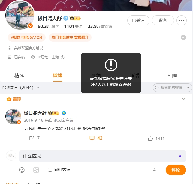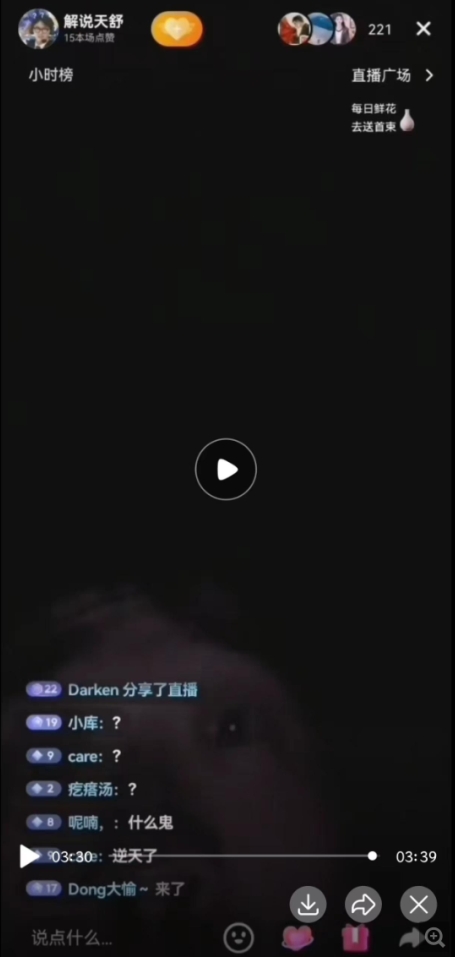 目前在网上未能找到关于天舒直播的录屏内容,只有一张直播截图与天舒本人眼睛很像;目前天舒本人微博设置了关注7天以上才能评论。