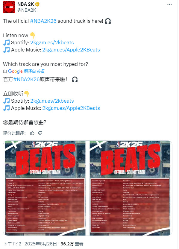 直播吧8月27日讯 NBA2K官方近日公开了《NBA2K 26》原声带歌曲列表,中国说唱歌手揽佬(SKAI ISYOURGOD,本名陈序垲)的爆火单曲《八方来财》也入选其中。