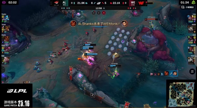 【17:20】WE包下抓死Shanks岩雀,推掉双边路一塔,回头又强行留到了Tarzan皇子!AL则是拿下先锋!随后河道交锋Karis阿卡丽再次游龙,Shanks岩雀又一次被秒!这波Karis阿卡丽根本管不住啊!Monki赵信跟随进场强杀Hope霞!这波WE打出1换3!3K经济差了!