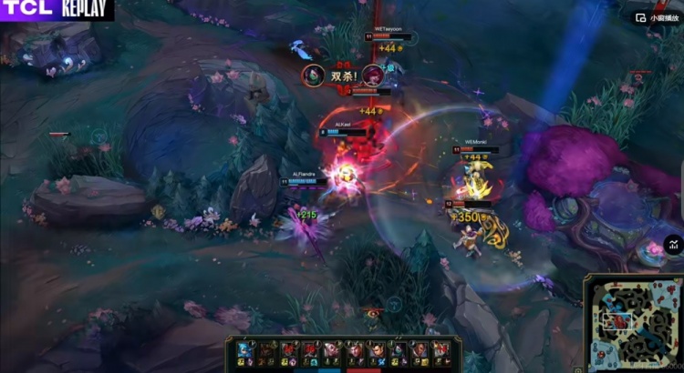 【8:50】Taeyoon卢锡安在中路被AL下路组合力逮捕,AL拿下三虫,WE换掉第一条小龙!