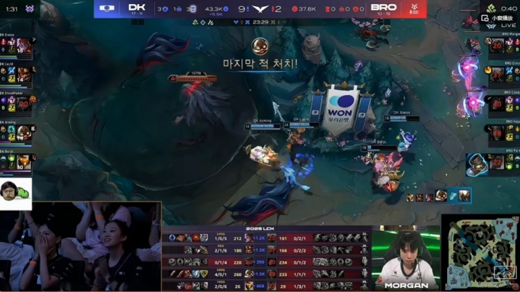 第二局Siwoo兰博越塔单杀Morgan约里克拿下一血!DK前期节奏不断+团战大获全胜早早拿下大优势,20分钟一万经济差劣势的BRO毫无反抗之力,DK仅仅25分钟结束比赛,横扫击败对手也终止了对于对手的三连败!
