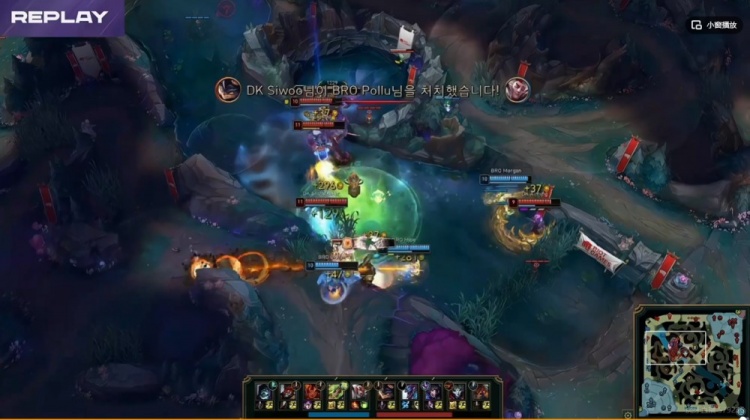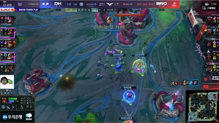 【29分钟】高地团Siwoo阿萝拉罩大配合队友秒掉了Croco潘森,装备差距DK直接一拥而上再次团灭BRO,一波结束掉了首局的比赛!