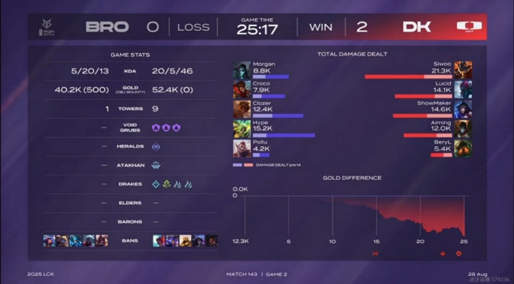 直播吧8月28日讯 2025年LCK第三赛段比赛进入收官阶段,今天的首场比赛是LCK的DK对阵BRO!