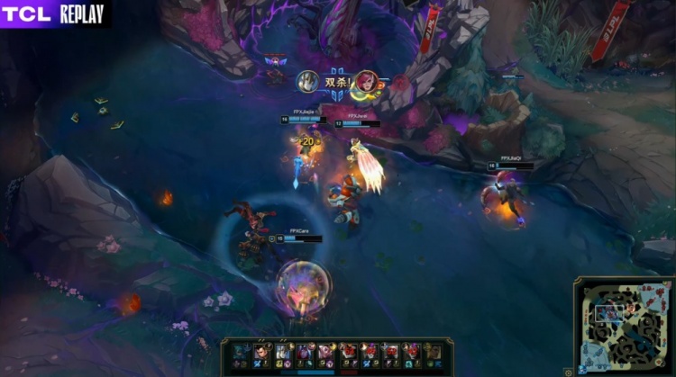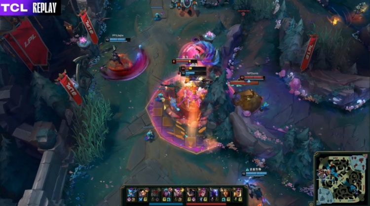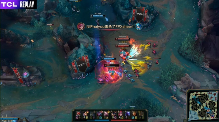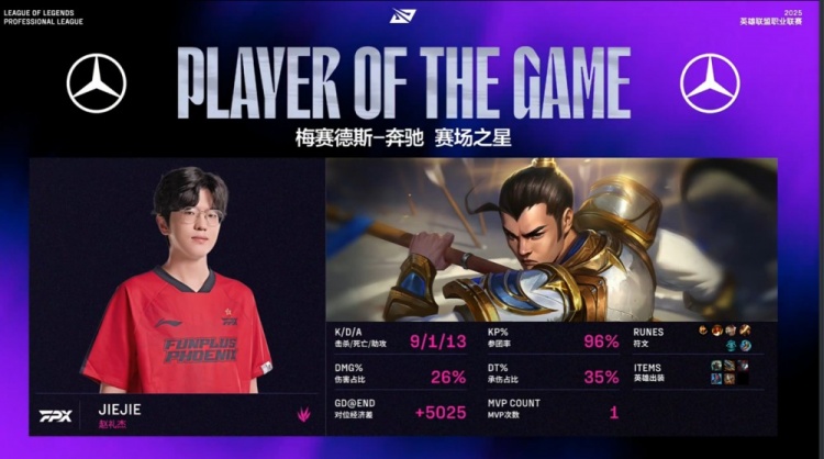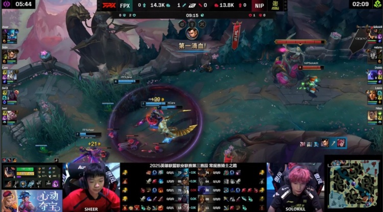 第一局前期Jiejie赵信多次来到上路,先后配合Jwei洛与sheer格温击杀naiyou蔚和Solokill兰博,帮助FPX建立经济领先。