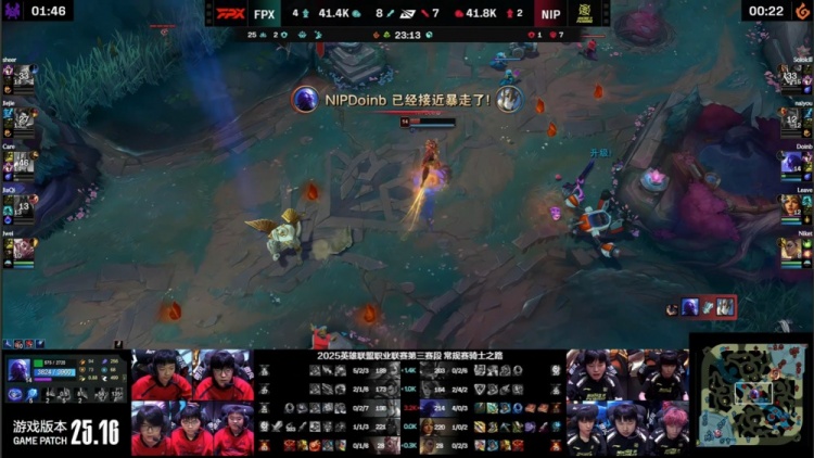 【16:19】FPX中路放出先锋撞掉NIP一塔,经济领先1.5k。
