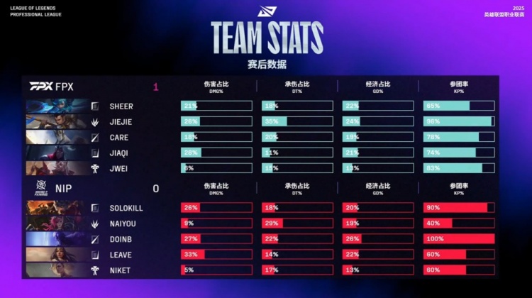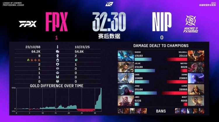 后期Doinb瑞兹开车带队友掏大龙被抓,Niket芮尔被击杀,FPX顺势开大龙,sheer格温控下火龙魂,Care加里奥连续击杀Doinb瑞兹与naiyou蔚,FPX打出0换4拿到大龙。最终FPX推掉上中两路高地,在水晶前团灭NIP,一波推平NIP基地先下一城。