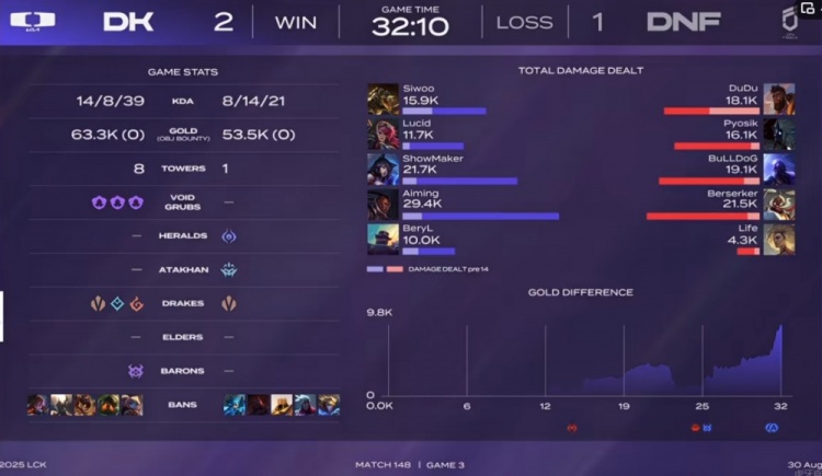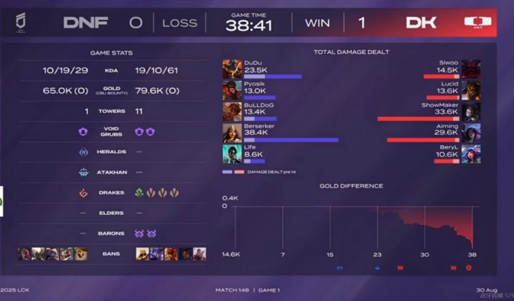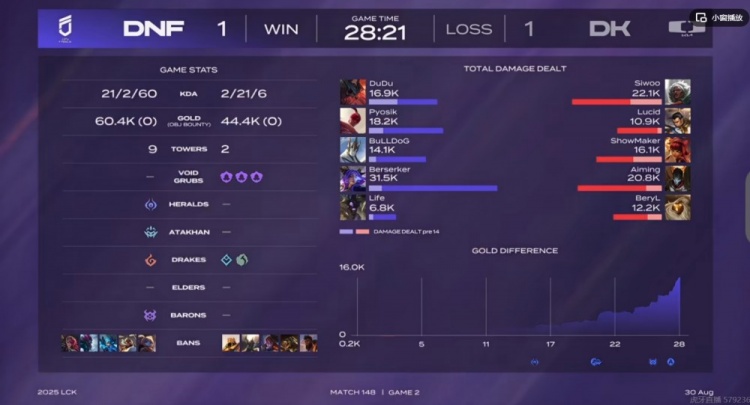 直播吧8月30日讯 2025年LCK第三赛段比赛进入收官阶段,今天的第二场比赛是涅槃组的DNF对阵DK!