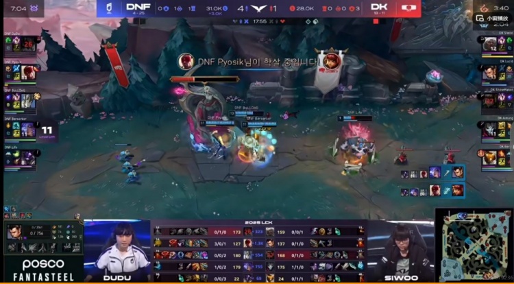 第二局比赛Pyosik绝活盲僧带起节奏,DNF前面几乎全线优势拿下主动权和经济差,中期DNF先是Berserker芸阿娜四杀,厄塔汗团团灭DK,随后又是上路团战探照找到了埋伏绕后的SMK安妮!将他和Siwoo安蓓萨解决之后DNF再拿大龙,最终芸阿娜高地团收割帮助队伍扳平了比分!