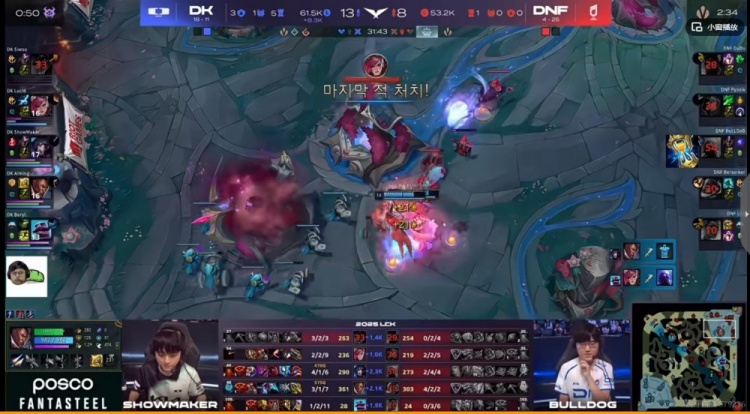 【27分钟】DK中路主动出击,BeryL妮蔻闪现大强开BuLLDoG岩雀,和ShowMaker发条大招打出了Combo!Aiming卡莎开飞,DNF两人瞬间被秒!残局Berserker希维尔尽力和SMK发条互换!这波最终是DK打出1换4,回头拿下大龙!