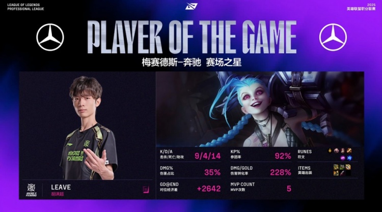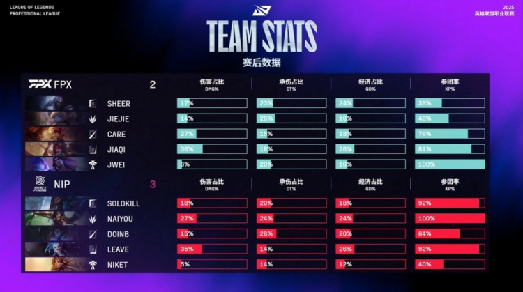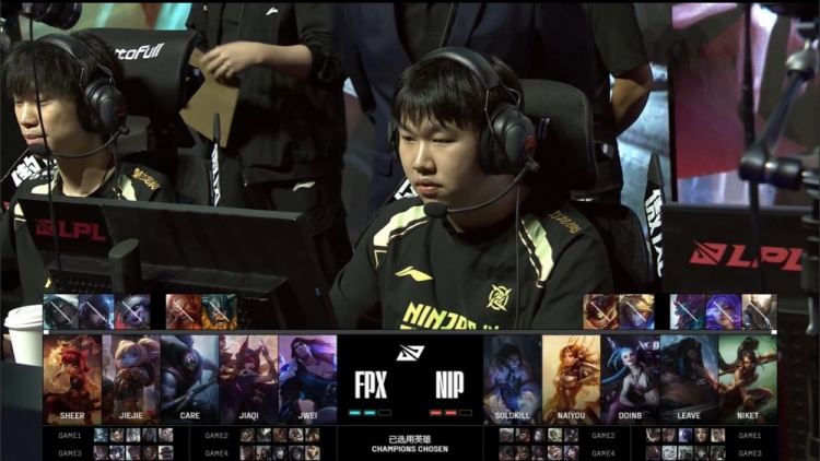 决胜局开场,naiyou豹女入侵FPX野区被抓送出一血,随后naiyou打完自家红buff后进FPX野区单杀Jiejie。下路2v2,Jwei宝石与JiaQi卡莎配合带走NIP双人组,小龙团Care与JiaQi各取双杀,FPX打出0换5。紧接着巢虫团naiyou追击轰出三杀,NIP经济落后2k。