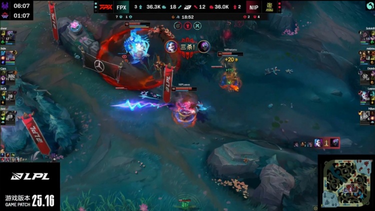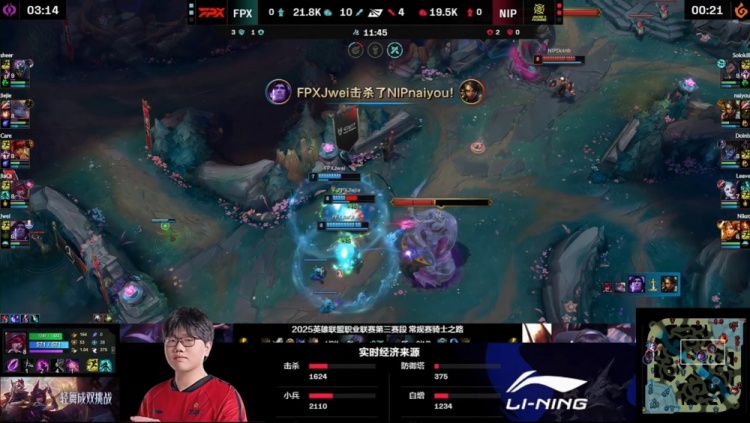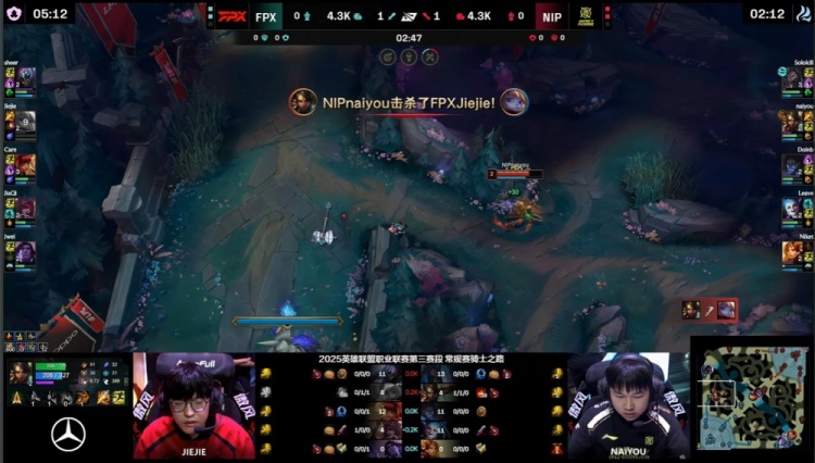 【11:48】FPX三人中路越塔逮捕niayou豹女,jiejie闪现将其壁咚上墙,NIP推掉FPX上路一塔,经济落后2.5k。