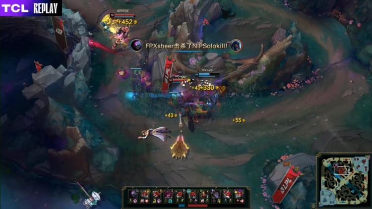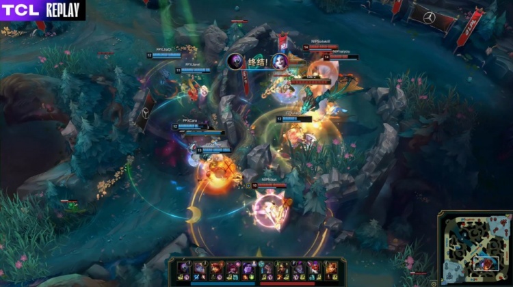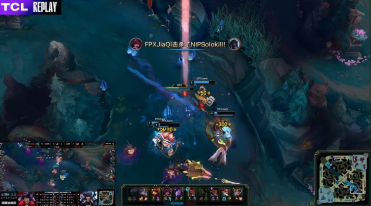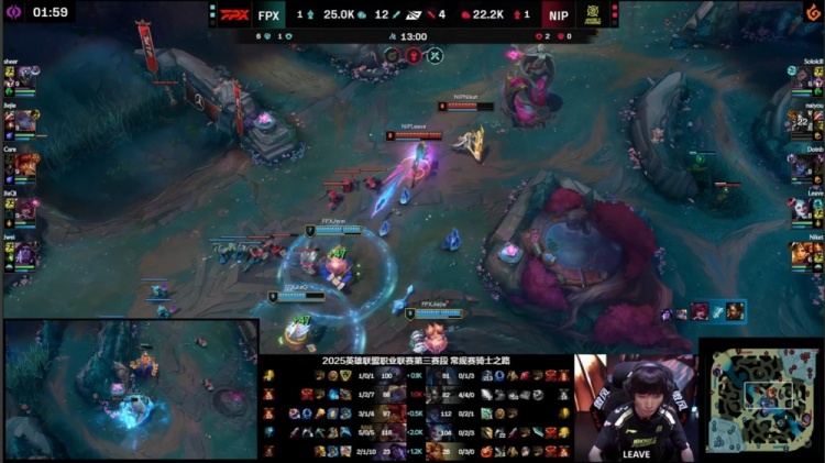 中期naiyou与Doinb被抓,先锋团Doinb塞拉斯拿到波比大招击飞FPX两人,JiaQi霞漫天飞羽闪E反杀Leave金克丝,Doinb复活后拿到JiaQi一千大米,NIP经济落后1k。随后河道交火,Doinb塞拉斯开出宝石大招,Leave金克丝启动三杀,NIP扳平经济劣势。