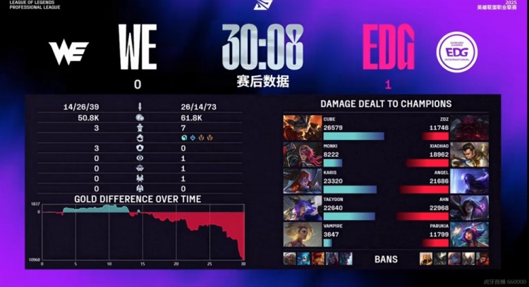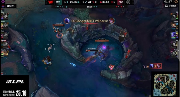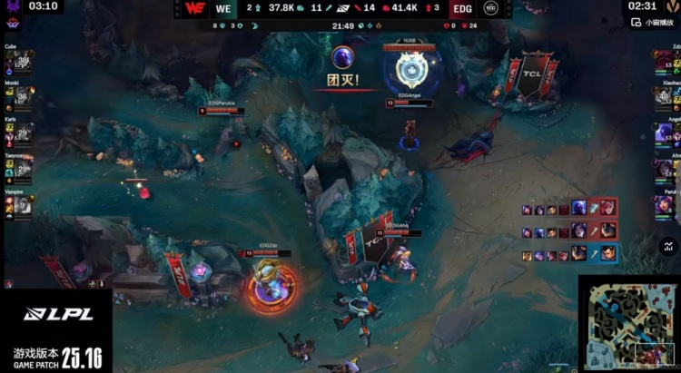 【21:30】Monki蔚大招强锁Angel瑞兹被他交闪过墙拉扯,WE控制没接上,EDG支援到了啊!Zdz奥恩大招帮助Angel瑞兹直接双杀!Angel瑞兹开车追击,Cube兰博大招虽然配合队友击杀Xiaohao赵信但也就这样了!EDG打出1换5团灭WE,再拿荆棘厄塔汗!4K经济差了!
