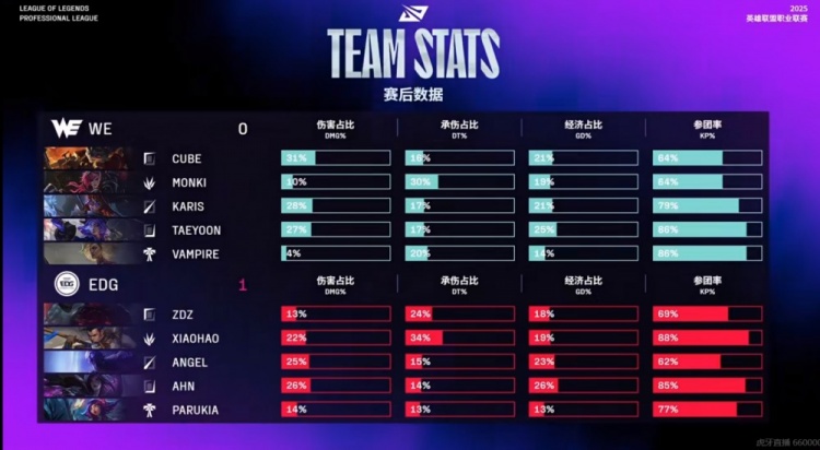 首局比赛WE下路一波1换3让Taeyoon芸阿娜双杀拿下优势,但是中期Parukia妮蔻几波开团和反开帮助EDG将局势打回!21分钟WE下路强动Angel瑞兹失败被反击,EDG击杀对手四人+拿下厄塔汗掌握比赛局势!龙魂团虽然WE上辅打出漂亮配合,但是Zdz奥恩残局贴脸切死Taeyoon芸阿娜没让他收割!EDG再拿大龙之后下路Ahn卡莎解决绕后蔚之后开飞下二塔拿下三杀!EDG团灭WE,先拿一分!