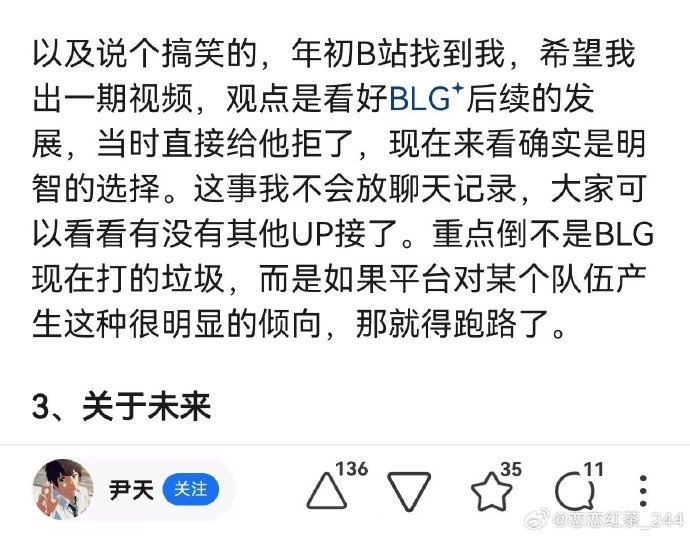 复盘博主尹天在知乎发帖:年初B站找到我,希望我出一期视频,观点是看好BLG 后续的发展 ,当时拒了。