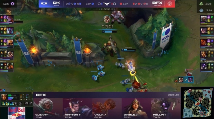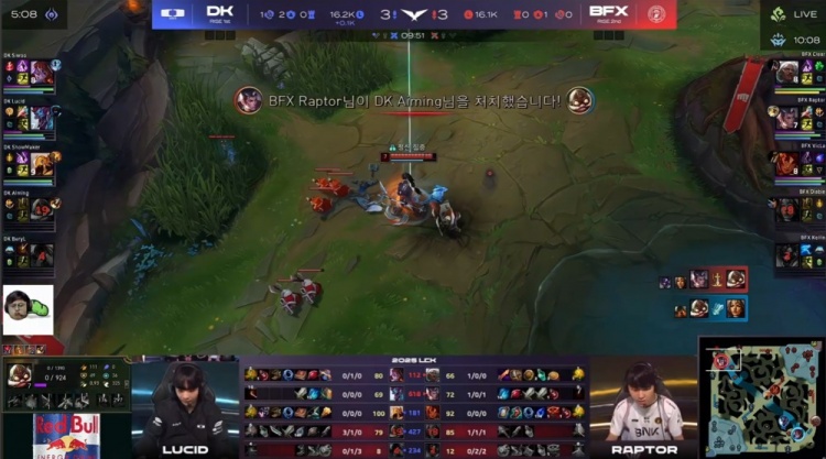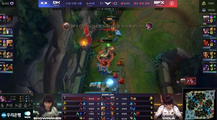 中期BFX多次进攻下路,VicLa岩雀阵亡送出人头,Raptor赵信与双人组在先锋处被DK击杀,Siwoo阿萝拉完成双杀,Lucid巨魔拿下先锋,许哥沙皇击杀Kellin牛头后帮助DK控下小龙,DK建立经济领先。