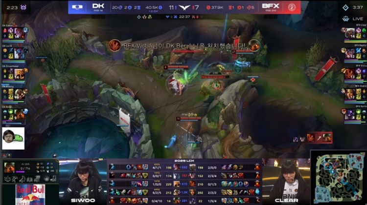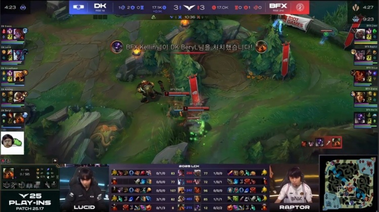 【10:35】BFX入侵DK野区逮捕BeryL泰坦,随后BFX三人越下,Siwoo阿萝拉TP来下,Raptor赵信走进DK野区,BeryL泰坦复活钩住Raptor让Siwoo吃头,许哥中路持续发育。