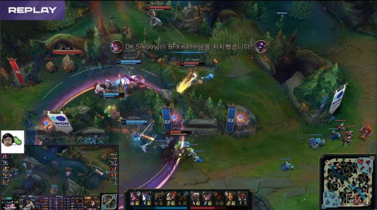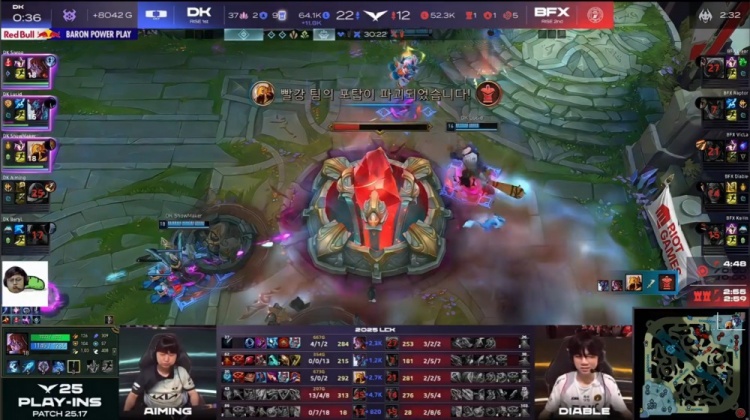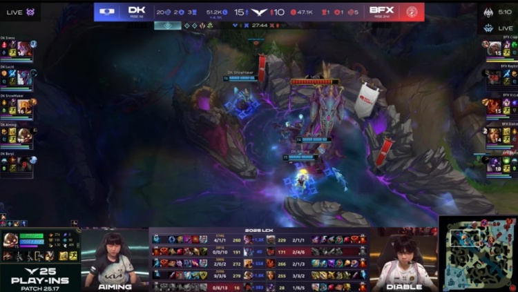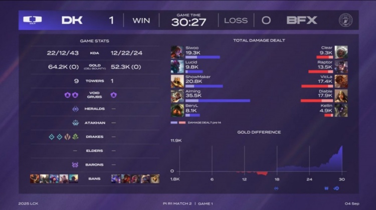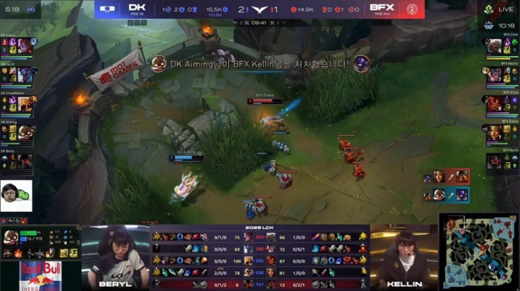 后期Aiming飞机在中路接连击杀Kellin牛头与Clear安蓓萨,DK拿到电龙魂后进一步扩大优势逮捕Raptor赵信,Lucid巨魔掌控大龙,Siwoo阿萝拉与许哥沙皇持续输出,Aiming飞机完成三杀,DK团灭BFX,一波推平BFX基地先下一城。