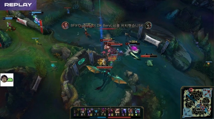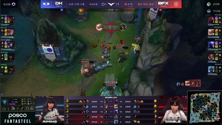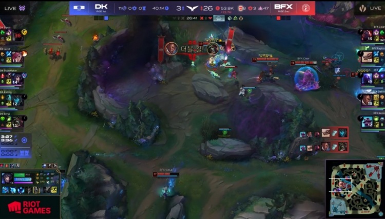 【19:25】野区混战,Siwoo奎桑提再次顶在前面被杀,Diable卢锡安瞬间三杀,BFX打出0换4。