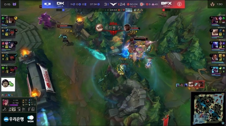 中期Diable卢锡安开团打出伤害,Raptor冥犬持续收割完成三杀,BFX逐渐建立经济优势,Siwoo奎桑提数次被VicLa瑞兹击杀,BFX顺势拿下先锋。